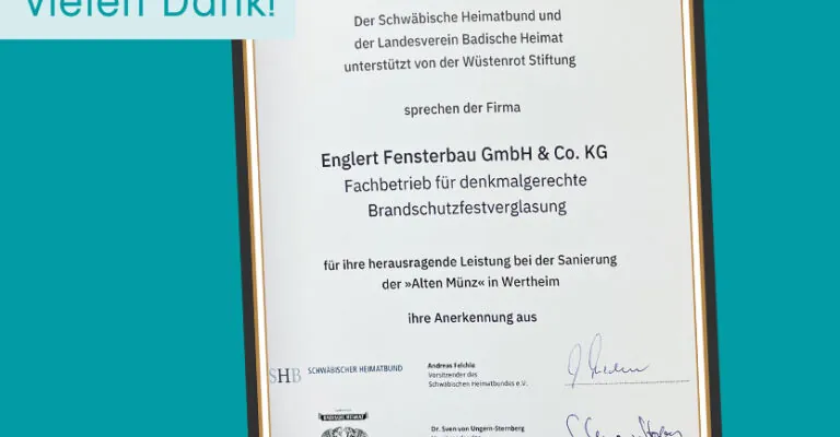 Bei einer Preisverleihung am 28.04.2025 in Achern wurde der „Alten Münz“ der Denkmalschutzpreis Baden-Württemberg 2024 verliehen. 👏 Wir gratulieren herzlich zu dieser Leistung und freuen uns, für die denkmalgerechte Brandschutzfestverglasung ausgezeichnet worden zu sein!