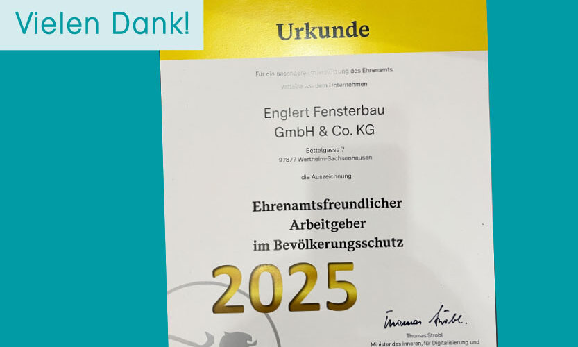 Bei einer Preisverleihung am 12.12.2025 in Tamm wurde Englert Fensterbau durch den Stv. Ministerpräsident und Innenminister Thomas Strobl als „Ehrenamtsfreundlicher Arbeitgeber im Bevölkerungsschutz“ ausgezeichnet. Wir freuen uns riesig über diese Anerkennung!