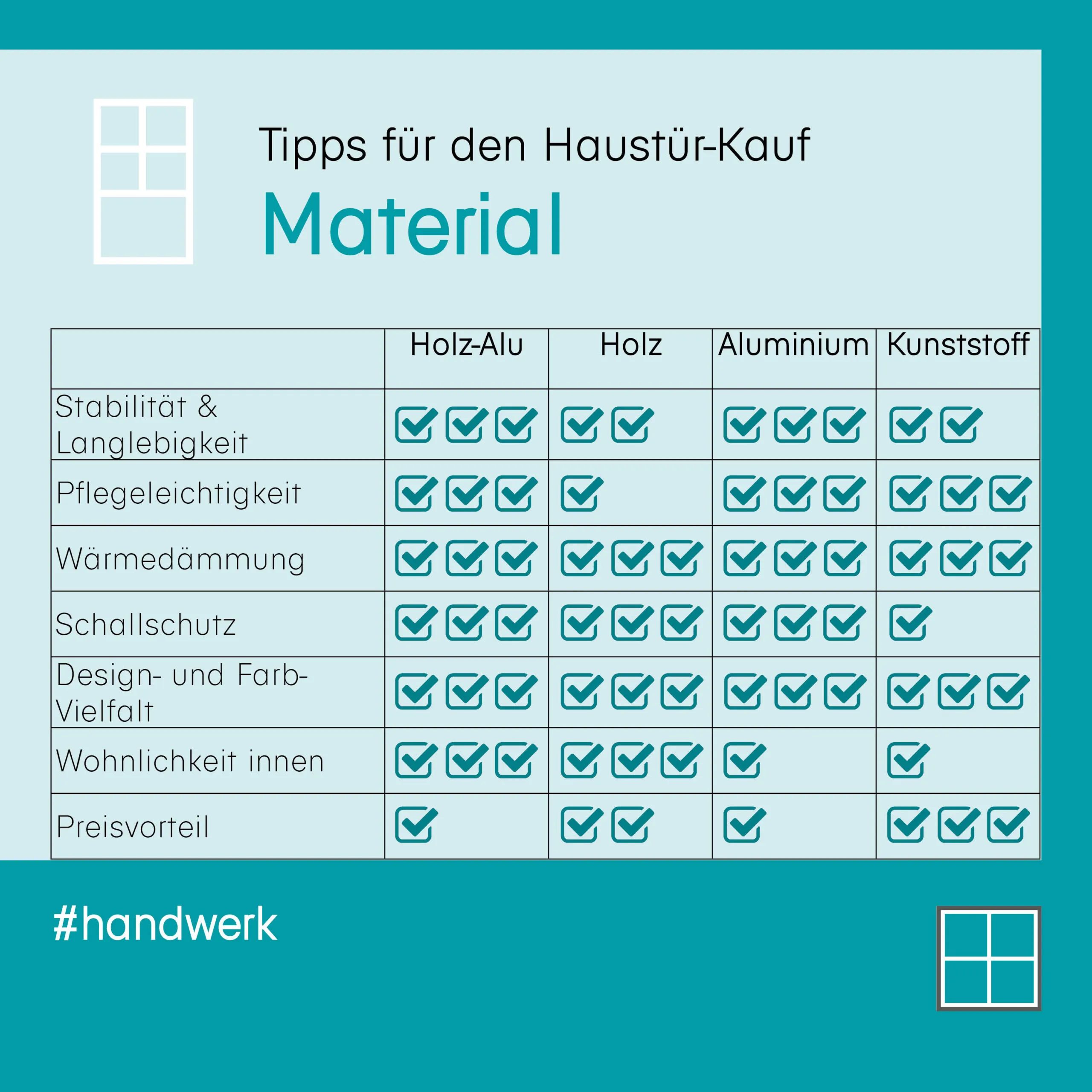 - Jedes Material hat seine Vor- und Nachteile. Haustüren aus Verbundwerkstoffen wie Holz-Alu, vereinen die Vorteile beider Materialien.