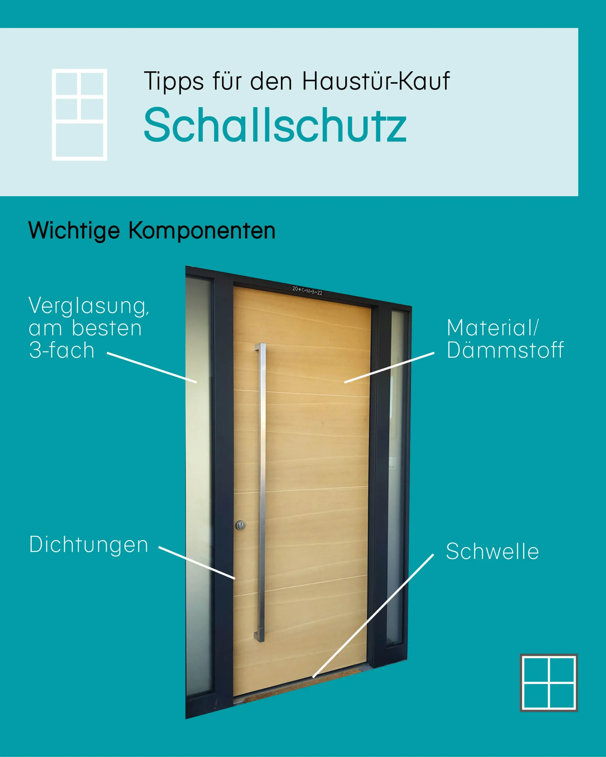 - Den besten Schallschutz bieten Aluminium, Holz und Verbundwerkstoffe (z. B. Holz-Alu-Haustüren). 3-fach verglaste Haustüren schützen besser vor Schall als 2-fach verglaste Türen.